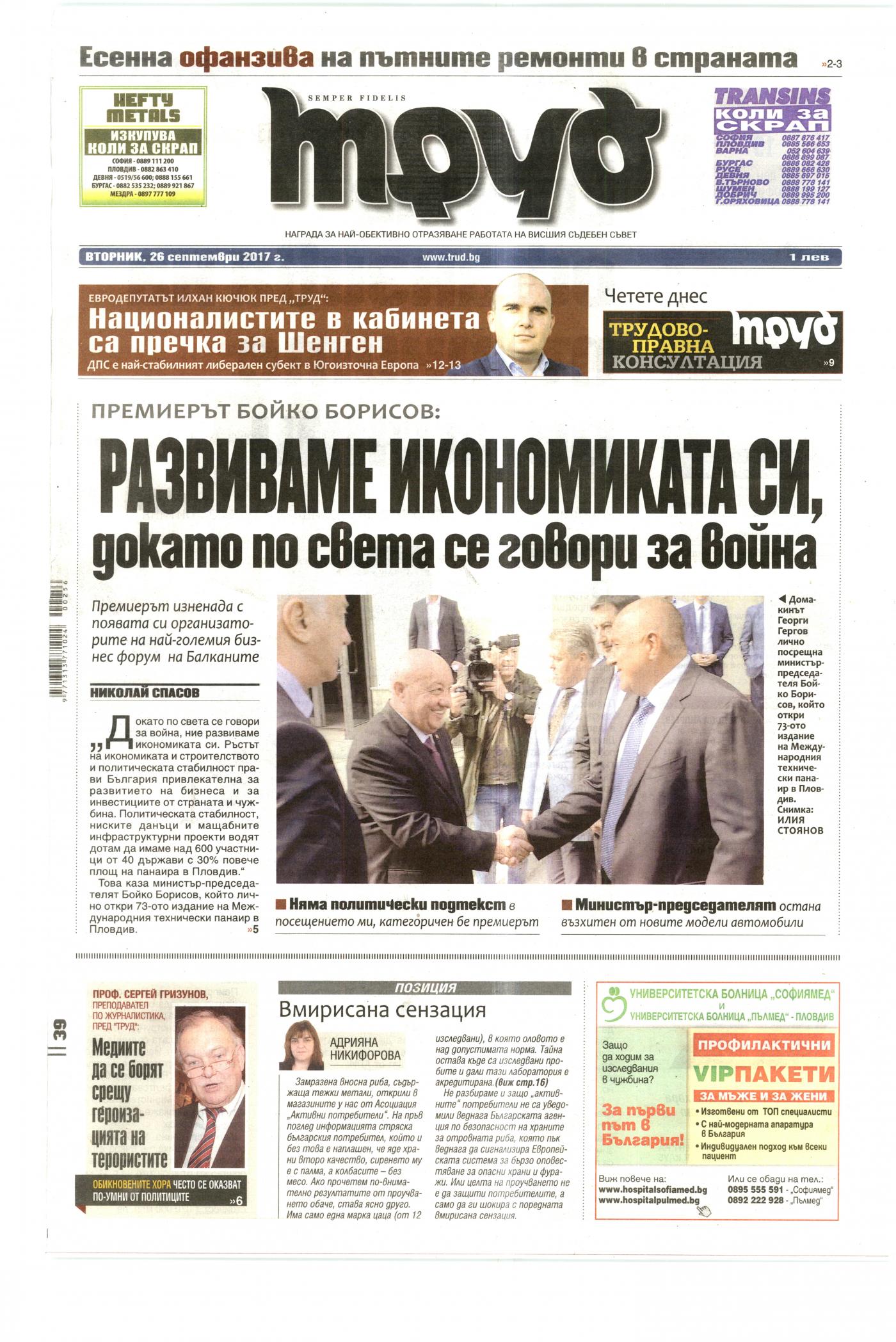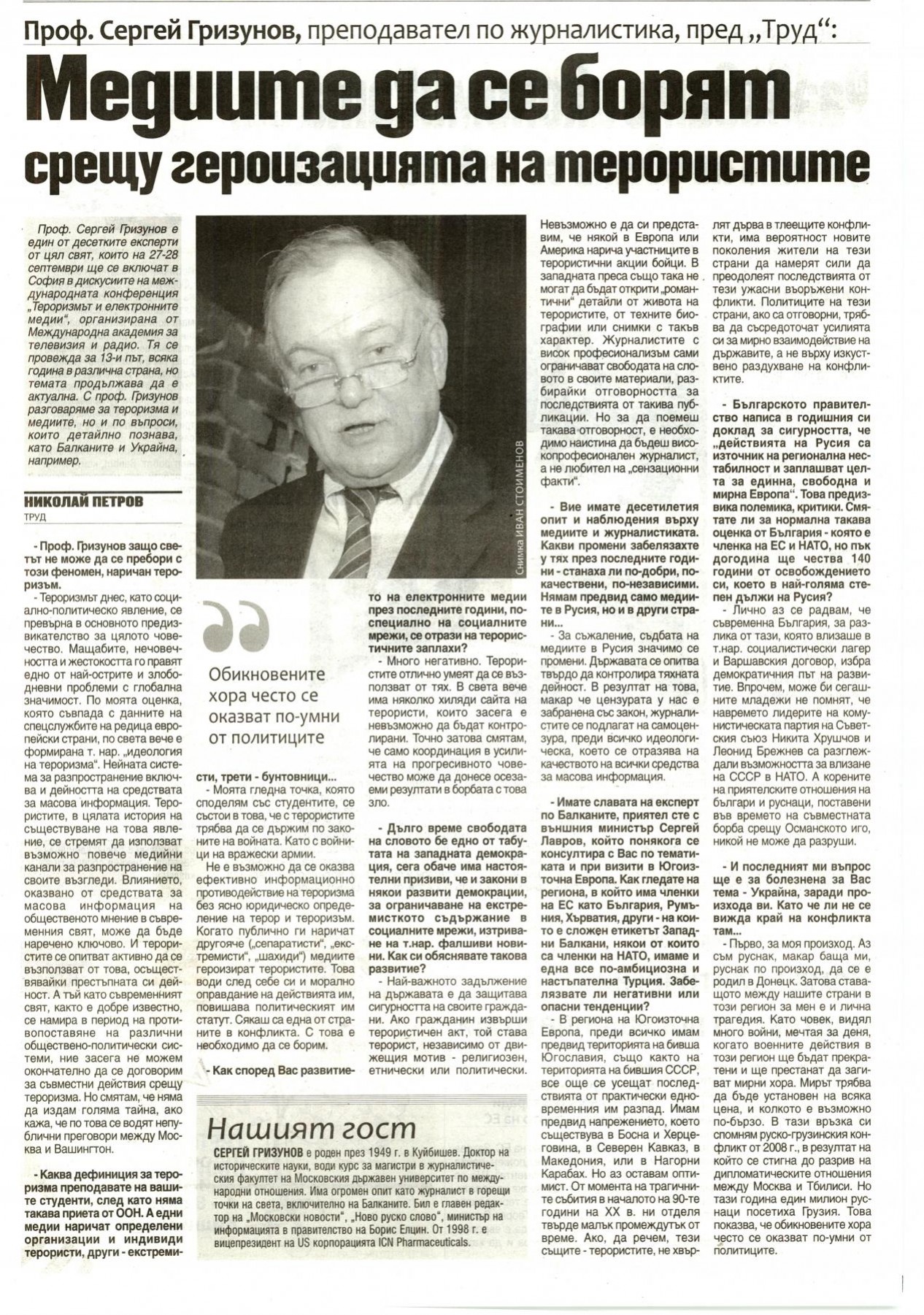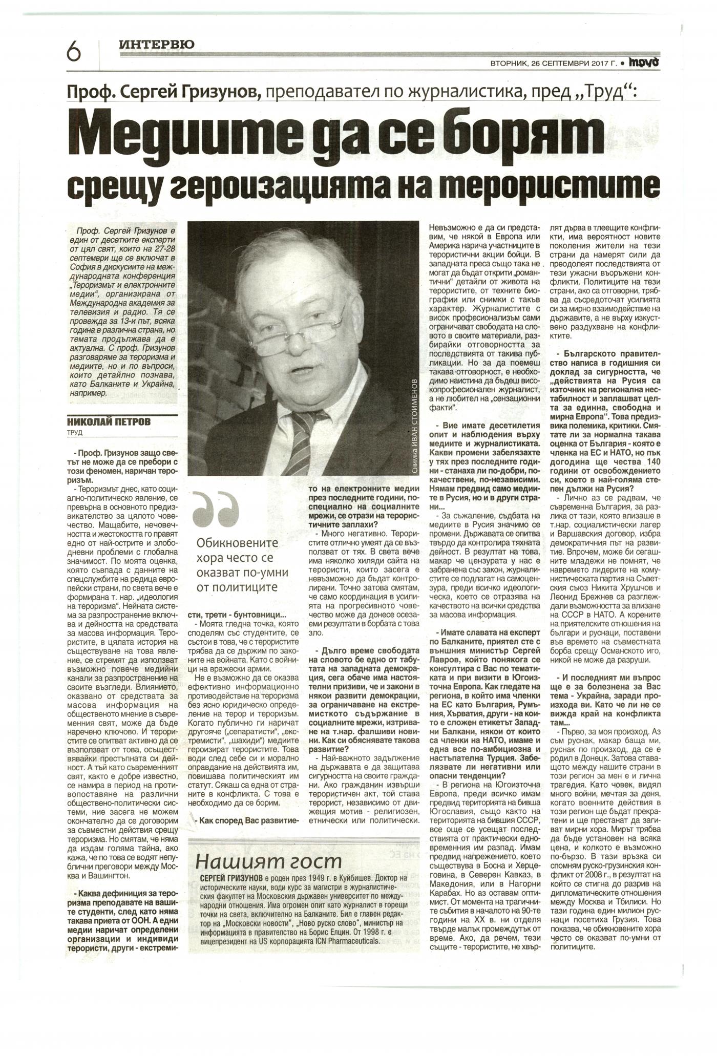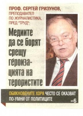 Проф. Сергей Гризунов, преподавател по журналистика, пред „Труд": „Meguume да се борят срещу героизацията на терористите“ | 26.09.2017 00:00 | Труд | стр. 1