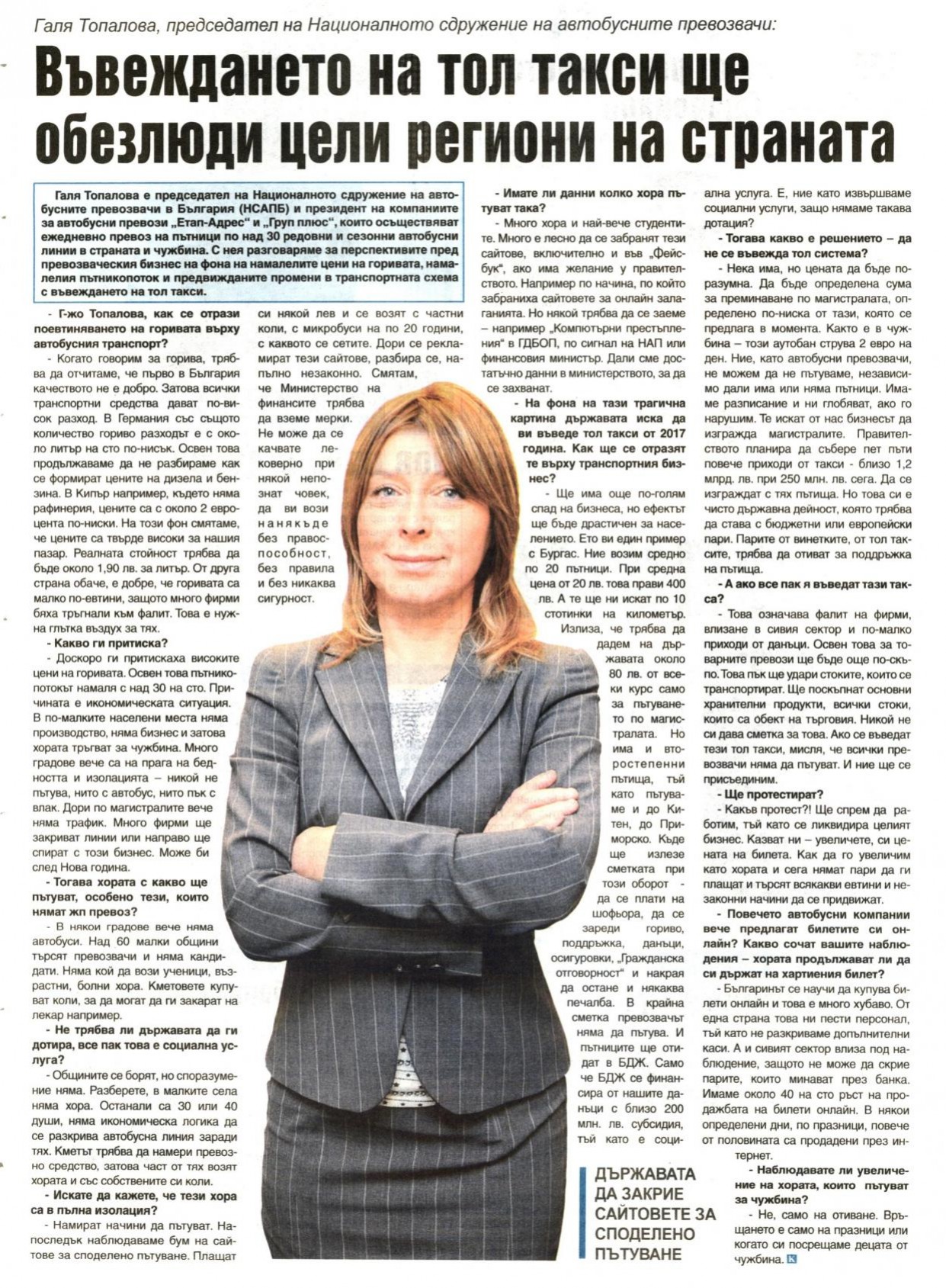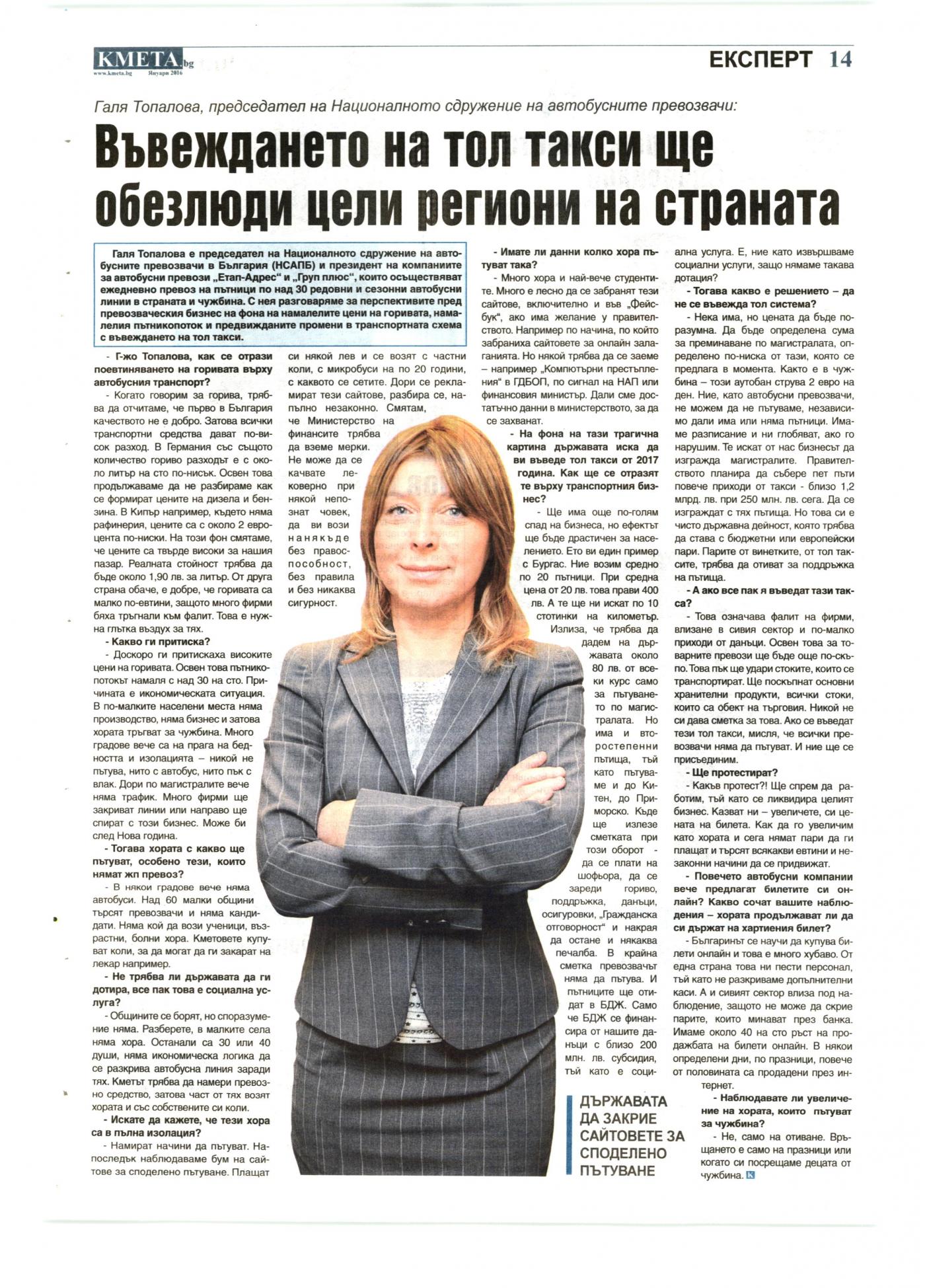 Галя Топалова, председател на Националното сдружение на автобусните превозвачи: Въвеждането на тол такси ще обезлюди цели региони на страната | 15.01.2016 00:00 | Кмета | стр. 14