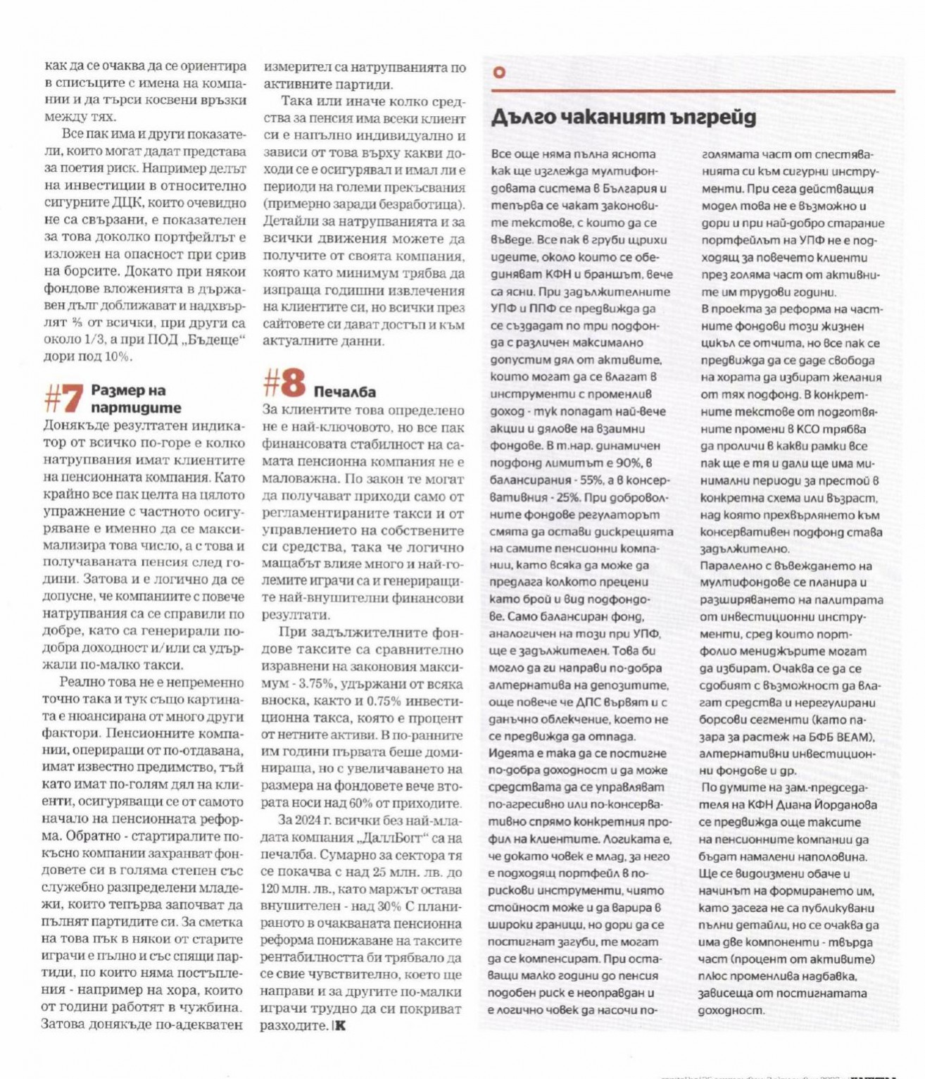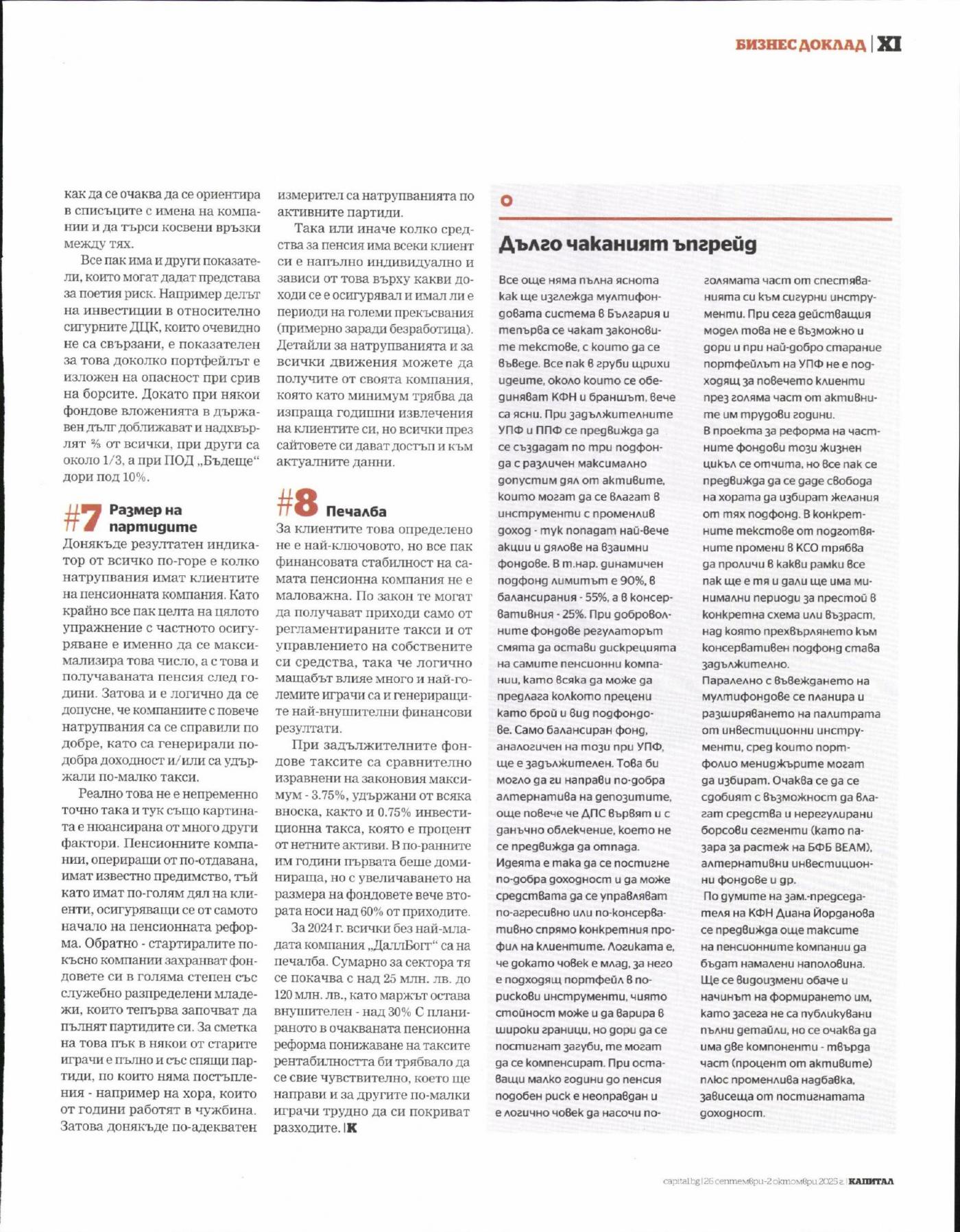 мярка. Вместо това през април те си дадоха шест месеца за изготвяне на пътна карта как да се подобри функционирането на пенсионната система. Тя, макар и насочена най-вече към държавното осигуряване, неминуемо ще засегне и частните пенсионни фондове. Всъщност това за тях може да е както добра, така и лоша новина. От една страна, най-накрая под принуда вероятно ще се случат някои реформи, за които се говори от години, но до тях така и не се стига. Най-яркият пример са мултифондовете. за които наскоро се получи препоръка от ОИСр а сигналите и от сектора, и от регулатора са, че не само се работи, а вече има готови предложения. От друга страна обаче, пакетирането им в мащабна всеобхватна реформа, по която вероятно ще има доста политически спорове, може да забави допълнително приемането им. А като се има предвид, че те вече две десетилетия са постоянно предъвквани като идея, която си остава нереализирана, хоризонтът може отново да се окаже далечен.
