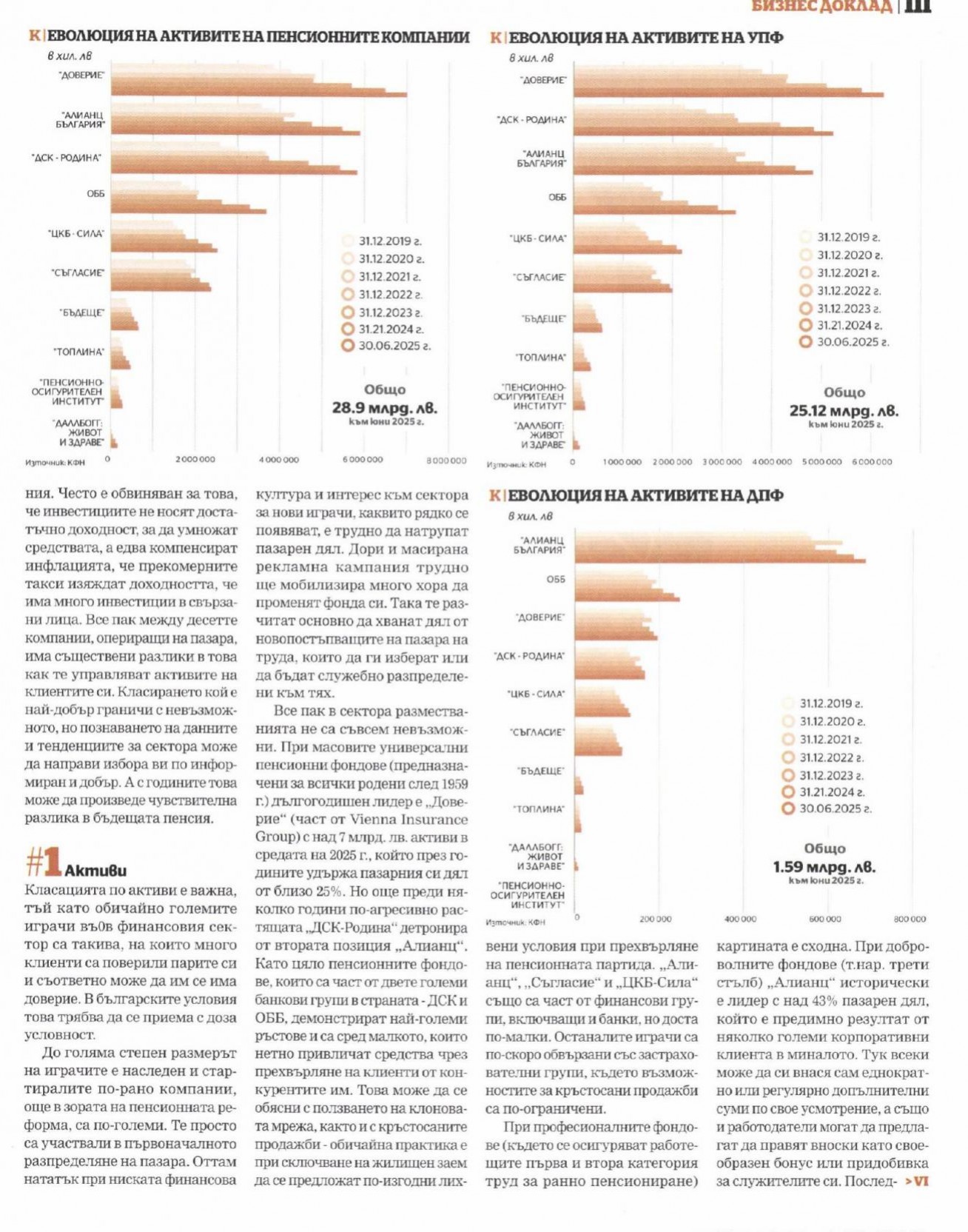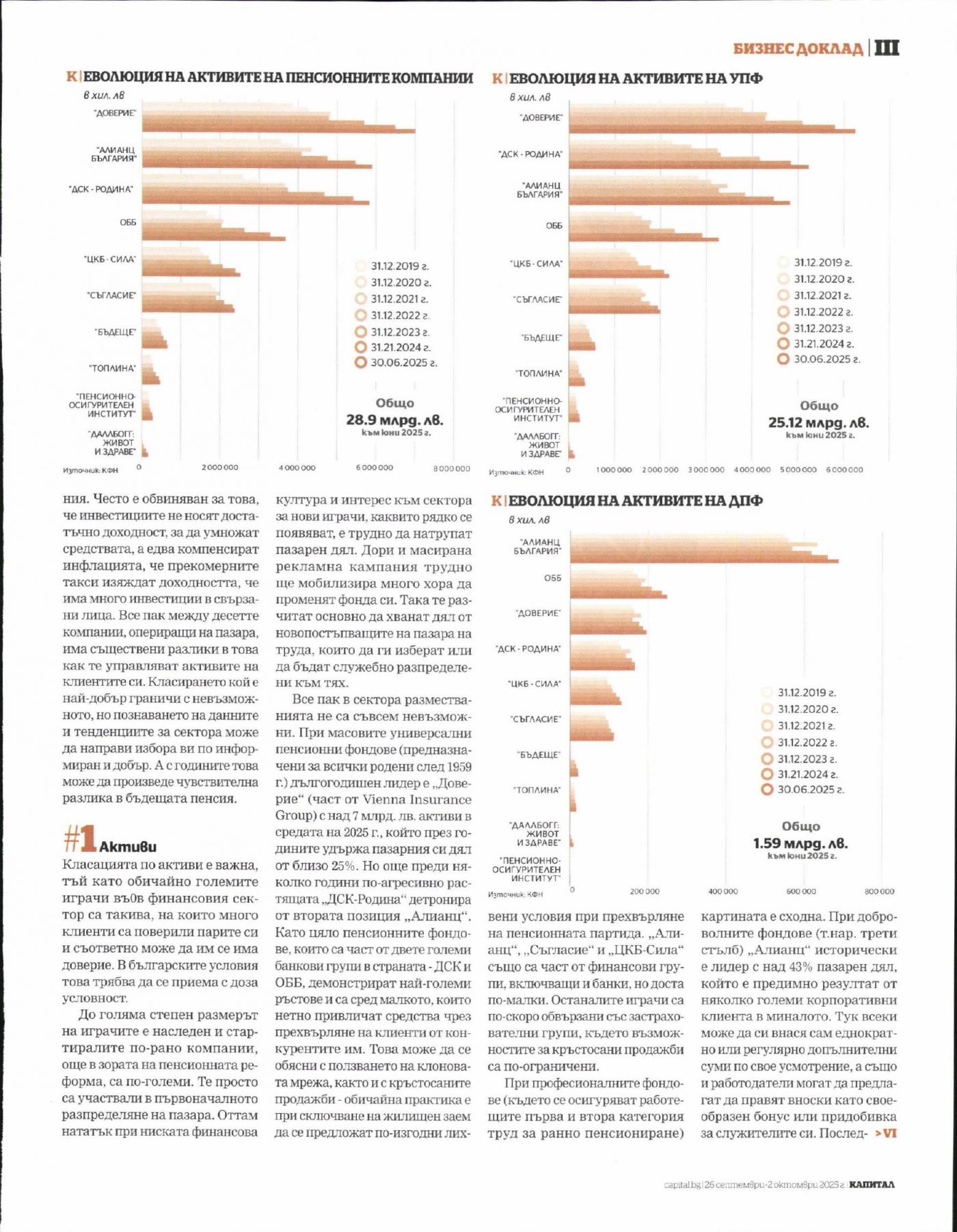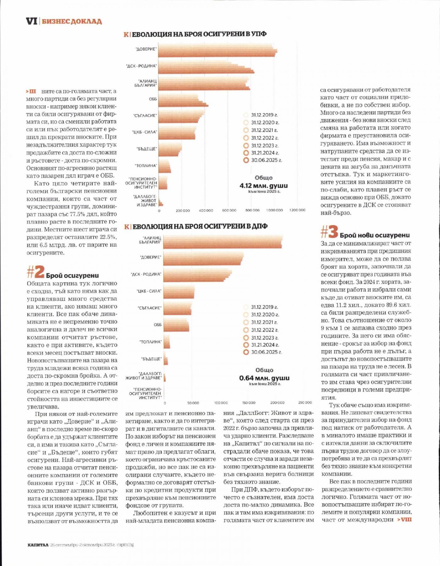 Все пак в сектора разместванията не са съвсем невъзможни. При масовите универсални пенсионни фондове (предназначени за всички родени след 1959 г.) дългогодишен лидер е „Доверие" (част от Vienna Insurance Group) с над 7 млрд. лв. активи в средата на 2025 г., който през годините удържа пазарния си дял от близо 25%. Но още преди няколко години по-агресивно растящата „ДСК-Родина" детронира от втората позиция „Алианц", Като цяло пенсионните фондове, които са част от двете големи банкови групи в страната - ДСК и ОББ, демонстрират най-големи ръстове и са сред малкото, които нетно привличат средства чрез прехвърляне на клиенти от конкурентите им. Това може да се обясни с ползването на клонова-та мрежа, както и с кръстосаните продажби - обичайна практика е при сключване на жилищен заем да се предложат по-изгодни лих-